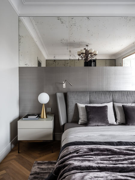 В другой спальне можно увидеть металлизированные обои в комбинации с состаренным зеркалом и «листьями» люстры, выполненными в дымчатом стекле.